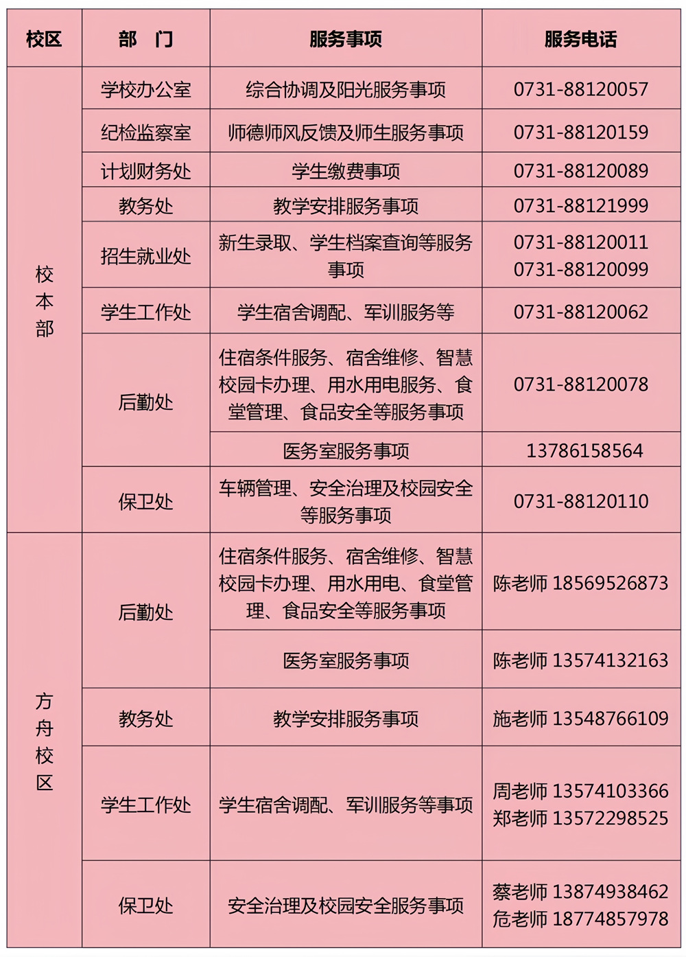 方舟校區(qū)服務(wù)熱線:陳老師 18670209186,接待地址:方舟校區(qū)學(xué)培樓一樓101室陽光服務(wù)中心。